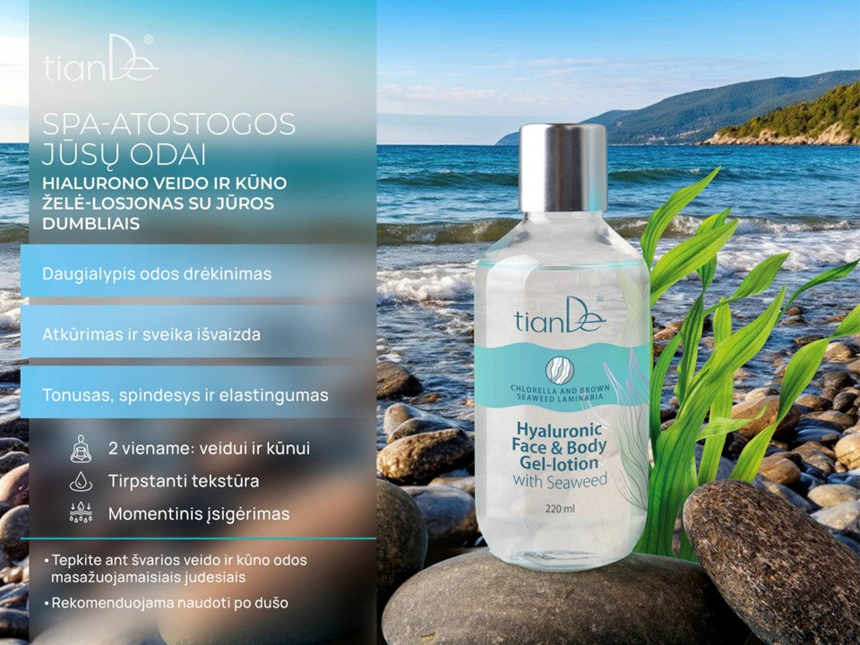 Šis hialurono gelinis losjonas su jūros dumbliais suteikia odai intensyvų drėkinimą, ramina ir maitina ją po prausimosi ar saulės poveikio. Jūros dumblių ekstraktai yra turtingi mineralais ir antioksidantais, kurie padeda odai atsinaujinti ir išlaikyti jaunatvišką išvaizdą.