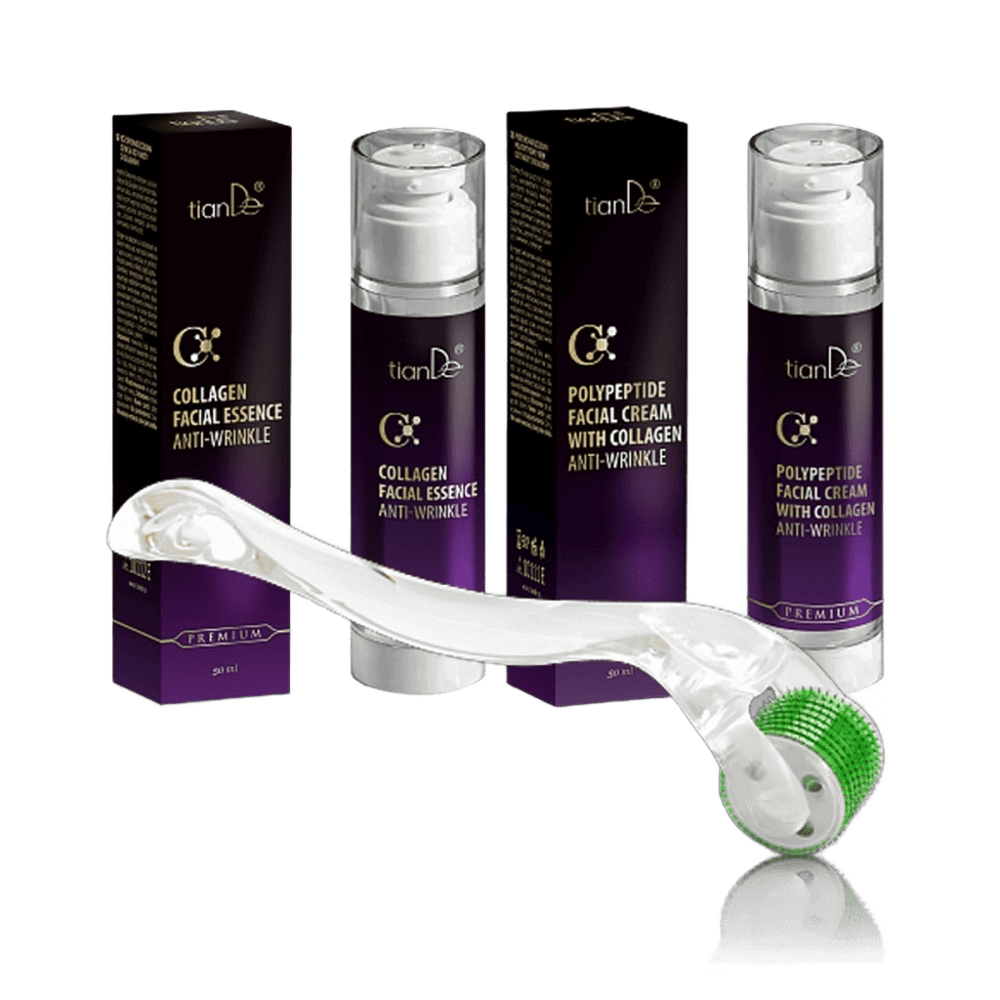 Pirk 2 priemones: veido esenciją nuo raukšlių su kolagenu + polipeptidinį veido kremą nuo raukšlių su kolagenu – PADOVANOSIME mezorolerį!